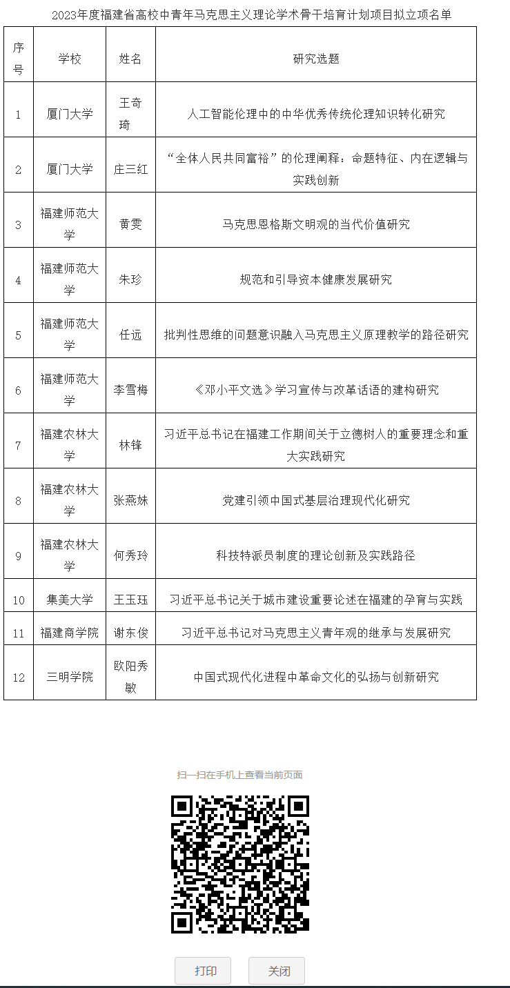 喜讯: 根据《中共福建省委宣传部、中共福建省委教育工委、福建省社会科学界联合会关于实施2023年度福建省高校中青年马克思主义理论学术骨干培育计划项目申报工作的通知》(闽委教思〔2023〕19号)要求,经有关高校推荐、专家评审,拟立项厦门大学王奇琦的“人工智能伦理中的中华优秀传统伦理知识转化研究”等12项高校中青年马克思主义理论学术骨干培育计划项目,世界杯官网谢东俊老师习近平总书记对马克思主义青年观的继承与发展研究获得立项。