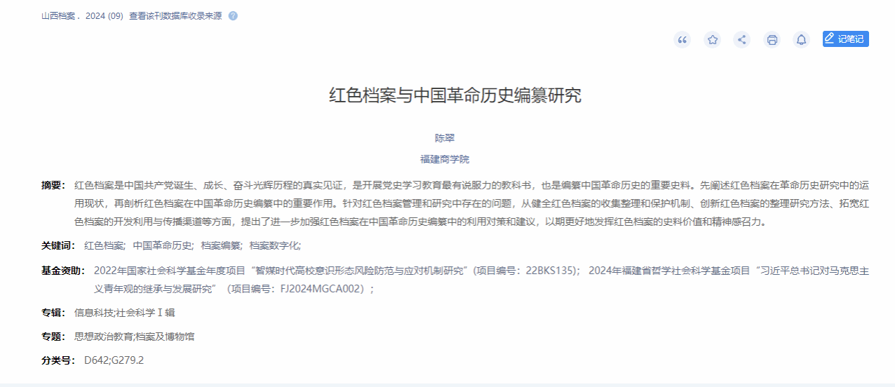 近日,世界杯官网陈翠教师在北大核心期刊《山西档案》发表文章《红色档案与中国革命历史编纂研究》。