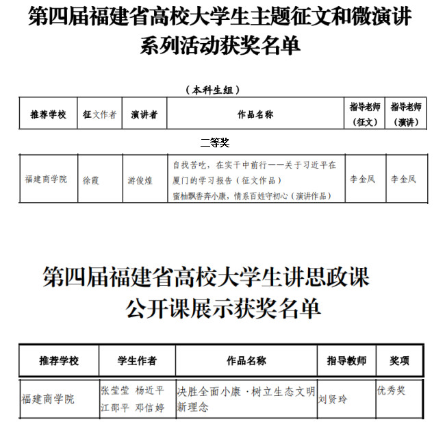 近日,省教工委公布的2020年度习近平新时代中国特色社会主义思想大学习领航计划系列主题活动中,由李金凤老师指导的“马克思主义能够给予我们什么——第四届福建省高校大学生主题征文和微演讲活动”中荣获二等奖,由刘贤玲老师指导的第四届福建省高校大学生讲思政课公开课展示活动中荣获优秀奖。具体获奖情况入下: