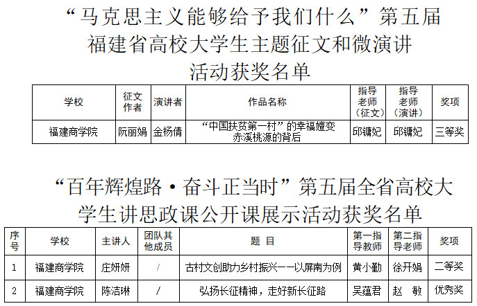 近日,《中共福建省委教育工委关于公布习近平新时代中国特色社会主义思想大学习领航计划系列主题活动获奖名单的通知》(闽委教思〔2022〕3号),世界杯官网选送优秀作品参评省级公开课、微电影展示以及主题征文和微演讲活动,荣获二等奖1项,三等奖1项,优秀奖1项。