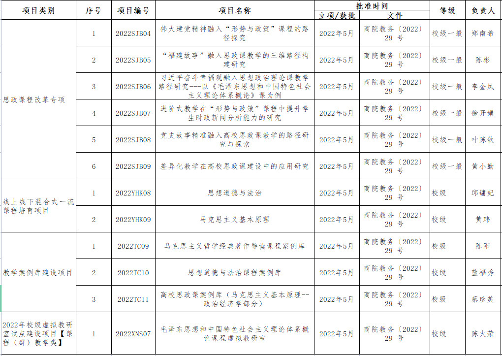 近期,关于公布2022年本科教育教学改革研究项目等立项名单的通知(商院教务〔2022〕29 号),世界杯官网思政课程改革专项立项6项,线上线下混合式一流课程培育项目立项2项,教学案例库建设项目立项3项,虚拟教研室试点建设项目【课程(群)教学类】立项1项。