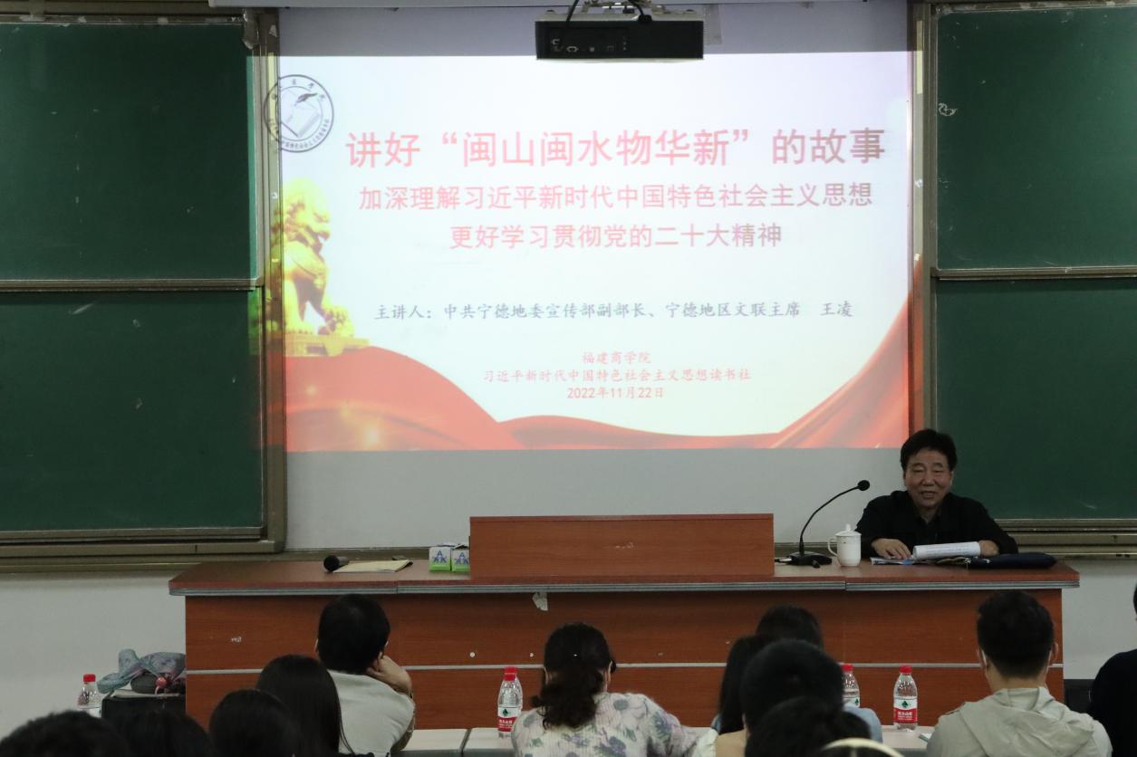 闽山闽水物华新,“习言习语”催人进。11月22日晚,中共宁德地委宣传部原副部长、原宁德地区文联主席王凌研究员受邀莅临世界杯官网,为世界杯官网师生作了题为《讲好“闽山闽水物华新”的故事,加深理解习近平新时代中国特色社会主义思想,更好学习贯彻党的二十大精神》的专题讲座。校党委副书记吴访益,世界杯体育官方网站、机关党委负责同志,学校习近平新时代中国特色社会主义思想学生读书社、教职工读书社社员代表参加。