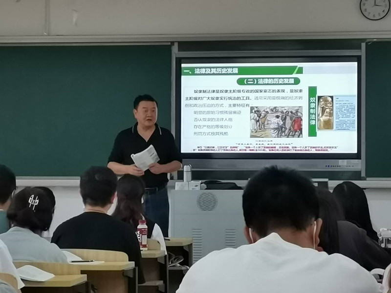 杨凡老师首先通过讲解引发社会热议的“大学生掏鸟案”,并设置问题“大学生掏鸟16只被判十年半,你认为冤不冤,量刑是否过重?”导入课程,进而紧扣知识要点从法律的含义和历史发展、社会主义法律的本质特征和社会主义法律的运行等三个方面讲解了作为人类社会重要行为规范的法律是什么,怎么来的和如何发挥作用等教学内容。授课过程中,杨凡老师注重以案说法,通过讲授法讲出吸引力和感染力,使抽象的理论具体化;注重寻找师生在认识上的契合点,通过讨论法,实现教学相长;注重运用图片、图像、声音、文字等多种媒介开展互动式教学,帮助学生增强对知识的理解,推动学生积极学习法律知识,尊重法律权威,提升法治素养。