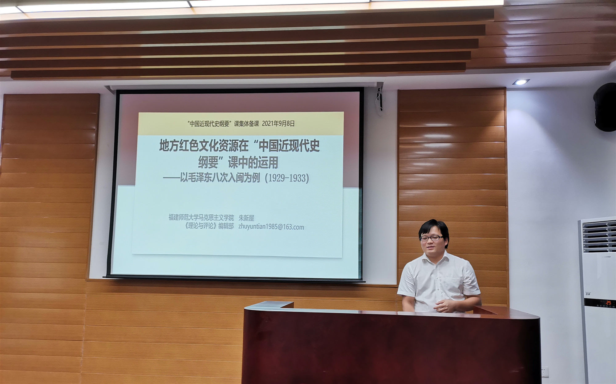 9月8日下午,党史学习教育省委宣讲团成员、福建师范大学朱新屋副教授应邀到世界杯官网作题为“地方红色文化资源在‘中国近现代史纲要’课中的运用——以毛泽东八次入闽为例(1929-1933)”的示范教学。校党委副书记吴访益和世界杯体育官方网站教师参加学习。