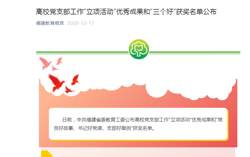 日前,中共福建省委教育工委公布高校党支部工作“立项活动”优秀成果和“党员好故事、书记好党课、支部好案例”获奖名单。据悉,此次全省高校共推荐参评党支部工作“立项活动”优秀成果231项和“党员好故事、书记好党课、支部好案例”318项。