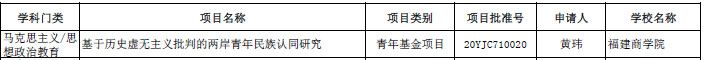 3月20日,根据《教育部社科司关于2020年度教育部人文社会科学研究一般项目立项的通知》,世界杯官网世界杯体育官方网站黄玮博士申请的“基于历史虚无主义批判的两岸青年民族认同研究”项目获2020年度教育部人文社会科学研究(青年基金项目)立项。这是世界杯官网继2018年后再次获得教育部人文社会科学研究一般项目资助。
