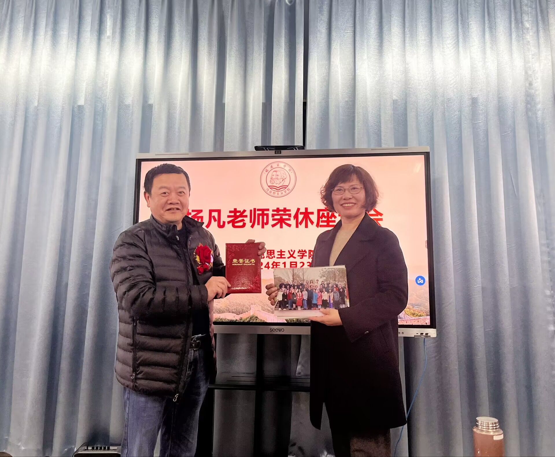 随后,世界杯官网为杨凡老师光荣退休举行隆重的欢送会。杨凡老师系世界杯官网思想道德与法治教研室教师,从教38年,退休在即。欢送会上,林萍院长为杨凡老师颁发了“光荣退休”纪念证书,并对杨凡老师为马院作出的贡献表示最诚挚的谢意。思想道德与法治教研室为杨凡老师献上鲜花及礼物,并表达了对杨凡老师的留念之情。接着,杨凡老师发表了深情的感言,感谢学校领导、单位同事的关心和厚爱,感恩在学院的每一天。最后,马院老师们纷纷表示:希望杨凡老师多与学院同仁联系,常回家看看,与学院共谋发展、与同仁共叙旧情。