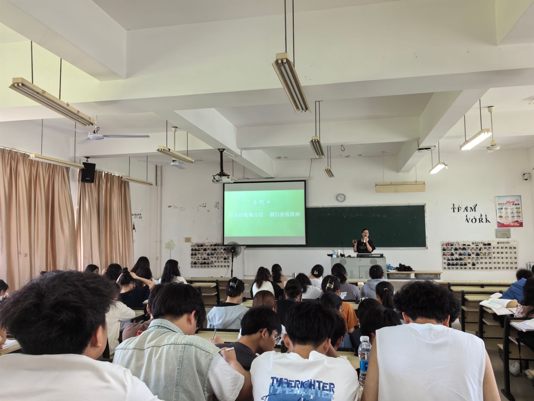 4月15日上午,世界杯体育官方网站思想道德与法治教研室蓝福秀老师以“坚定价值观自信 践行价值准则”为主题,在马尾校区至善楼楼T3教室开展本学期公开示范课教学,近110名师生参与观摩。