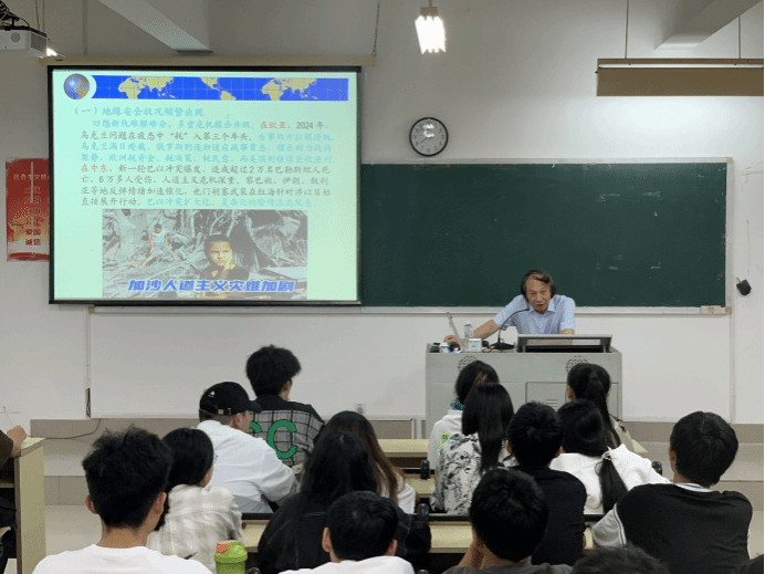6月6日晚7点30分,福建江夏学院世界杯体育官方网站郭健彪教授应邀到世界杯官网马尾校区远志楼T3教室作题为“当前国际局势与中国式现代化”的专题讲座,校马列经典著作读书社社员、校青马工程班学员共计90多人聆听了讲座。