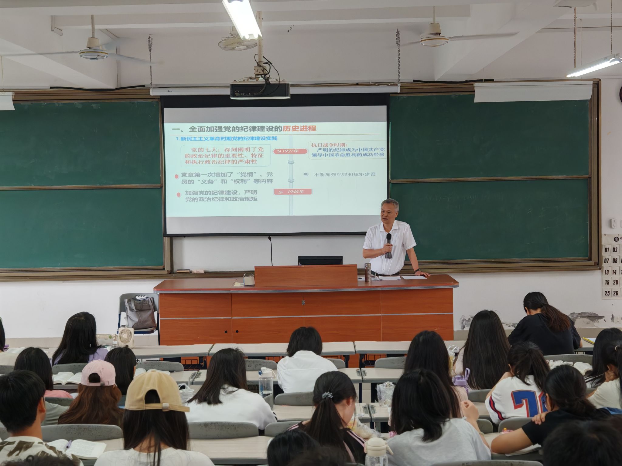 林宇峰从全面加强党的纪律建设的历史进程、中国共产党纪律建设百年实践的重要启示等两方面展开论述。他带领同学们回顾了党在不同历史时期对纪律建设的重视与推进,强调纪律建设中的党章的“根本大法”地位,“是全党必须遵循的总规矩”,深入剖析中国共产党在纪律建设实践中积累的宝贵经验
