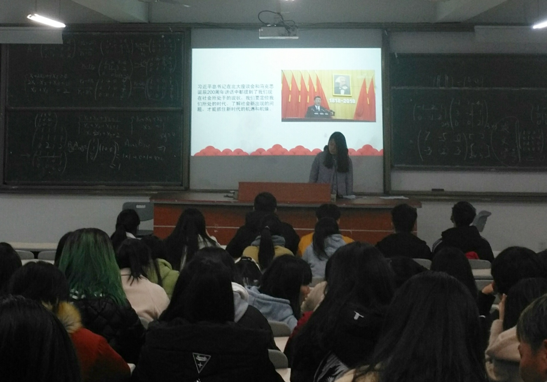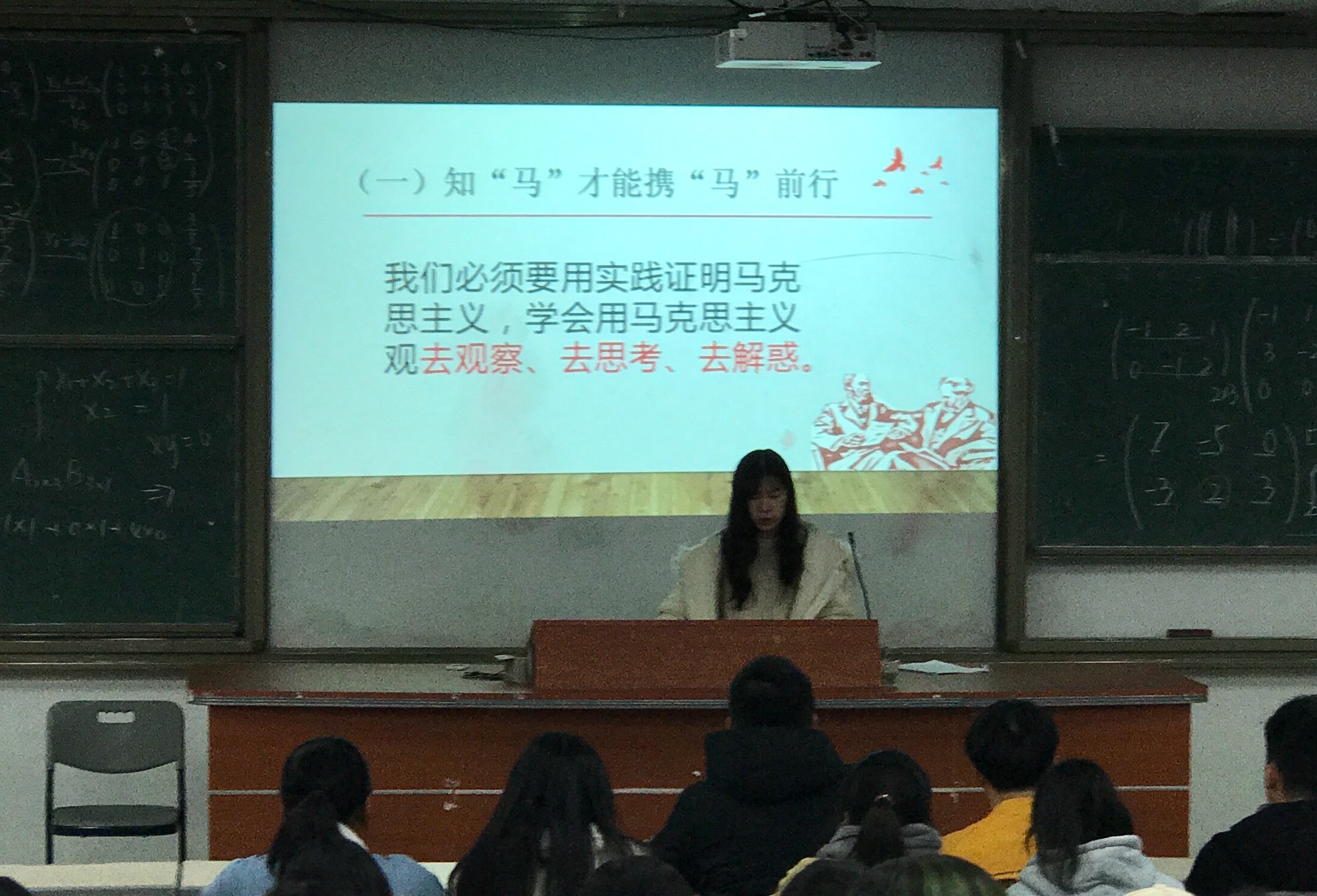 随后,韦雨晨同学与在场同学共同探讨了马克思主义与新时代中国特色社会主义的关系。她通过“知‘马’才能携‘马’前行”,“信‘马’方可指明道路”,“用‘马’能够推动发展”三个方面内容,环环相扣,层层递进,告诉同学们:国家当自强,青年当有为,不忘来时路,砥砺前行。