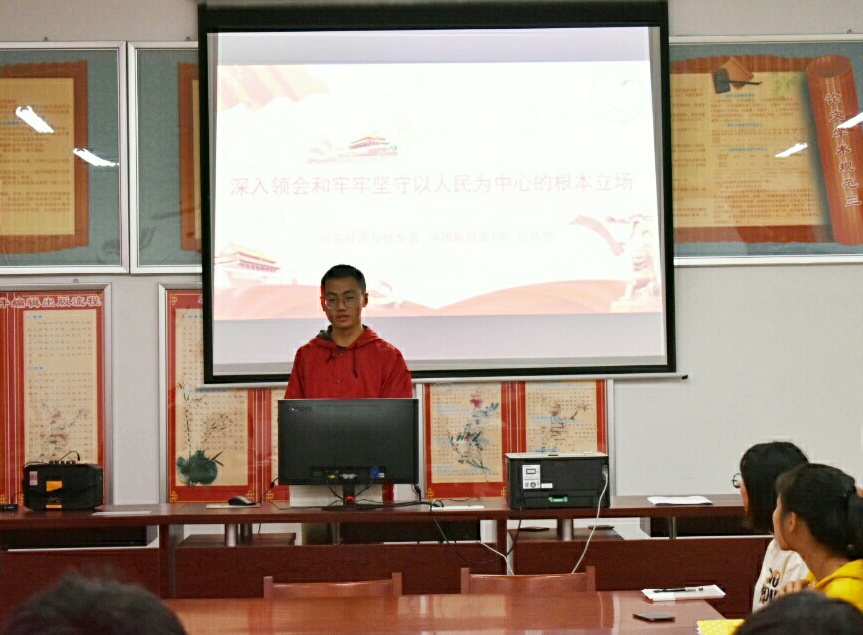 徐浩智同学从四个方面对主题进行阐述:一是始终全心全意为人民服务;二是依靠人民创造历史伟业;三是朝着实现全体人民共同富裕不断迈进;四是青年学子如何践行全心全意为人民服务。以人民为中心的发展思想是以习近平同志为核心的党中央在继承中国共产党人民观的基础上,在治国理政的长期实践与思考中逐步形成和完善的。“坚持以人民为中心”,最鲜明地体现了习近平新时代中国特色社会主义思想的人民立场这一根本政治立场。那么,作为青年学子,我们该如何践行全心全意为人民服务?浩智同学通过问答的形式,引导同学们认识到,当代青年学生首先要树立远大的共产主义理想,坚定实现共产主义的信念;其次,要努力提高自身的思想道德修养与政治理论水平;再次,要加强科学文化知识的学习;最后,要履行全心全意为人民服务的宗旨。正如浩智同学所说,“一切为了人民,全心全意为人民服务,深入领会和牢牢坚守以人民为中心的根本立场,这正是马克思主义给予我们的价值信仰,这正是马克思主义者的标准,这正是我们每一个人的责任和担当。”