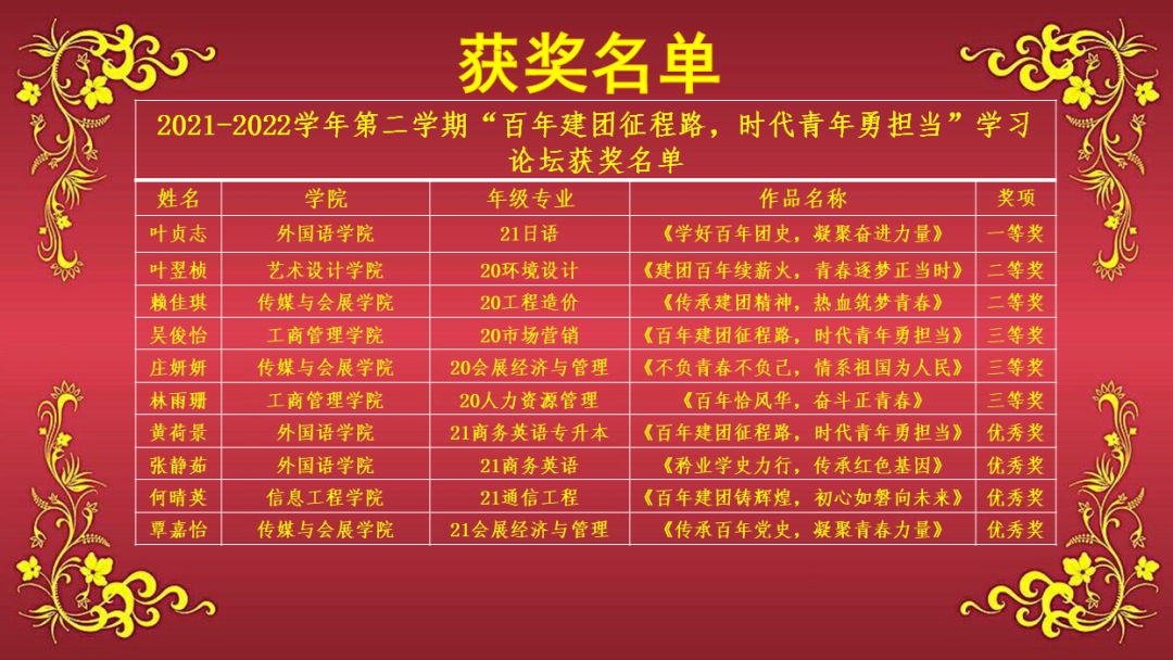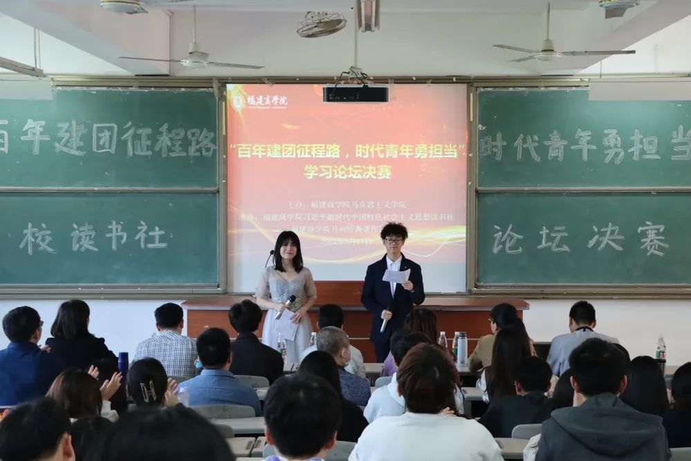 2022年5月17日下午,校习近平新时代中国特色社会主义思想读书社和校马列经典著作读书社在连江校区诚信楼中阶三举办主题为“百年建团征程路,时代青年勇担当”的学习论坛决赛。校党委副书记吴访益、世界杯体育官方网站部分教师及二级学院读书社相关指导老师、校读书社成员近200人参加了本次活动。