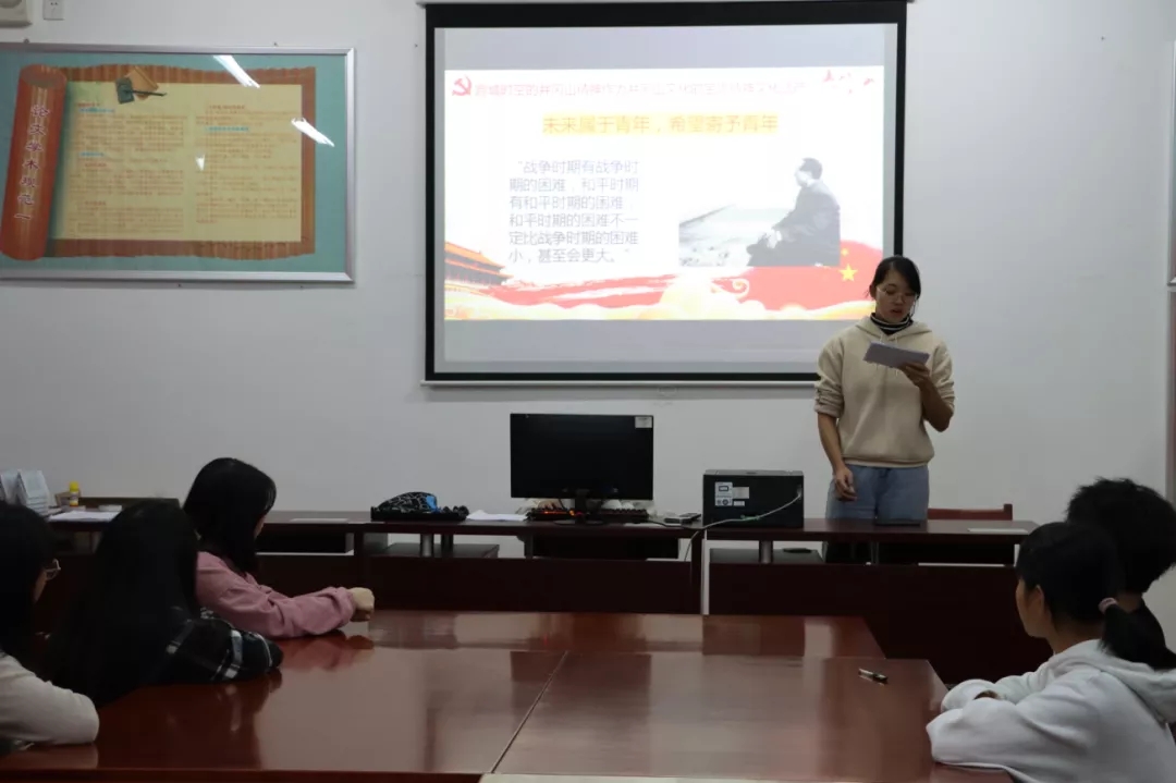 为进一步在青年大学生中深入学习贯彻习近平新时代中国特色社会主义思想,特别是深入学习领会党的十九届六中全会精神,理解中国共产党在百年奋斗中取得的伟大成就、历史经验,宣传中国共产党在百年奋斗中构建的中国共产党人的精神谱系,传承中国共产党人在中华民族伟大复兴征程中体现出的爱国情怀、高尚品格和精神风骨,汲取奋进力量,2021年11月26日,校读书社庄妍妍同学在连江校区自强楼读书社活动室开展了题为“走进点点星火,传承燎原之光”的宣讲活动,分享了自己的学习心得与感悟。读书社共有30多名社员参加学习活动。