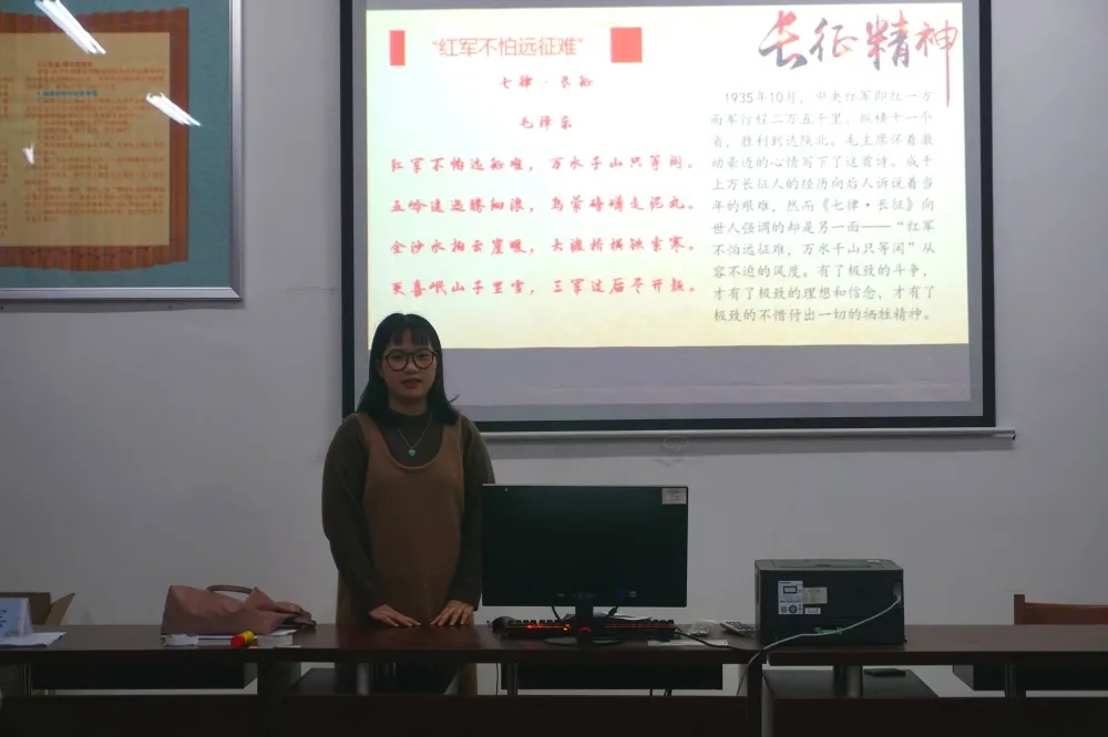 翁有恩同学用丰富的历史资料和感人的英雄事迹向大家讲述了“长征的历史”、“长征精神的内涵”;同时,她通过分析毛泽东《七律·长征》,阐释了长征对于中国共产党、中国革命的深远意义以及中国共产党人不怕牺牲、英勇奋斗的革命精神;此外,她在宣讲中结合大学生的发展,分析了长征精神的时代价值。她认为,对大学生而言,长征永远在路上,不论我们的学业、事业发展到哪一步,不论我们取得了多大成就,我们都要大力弘扬伟大长征精神,在新的长征路上继续奋勇前进。