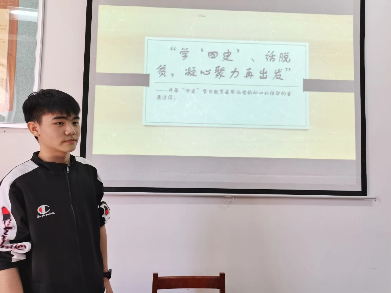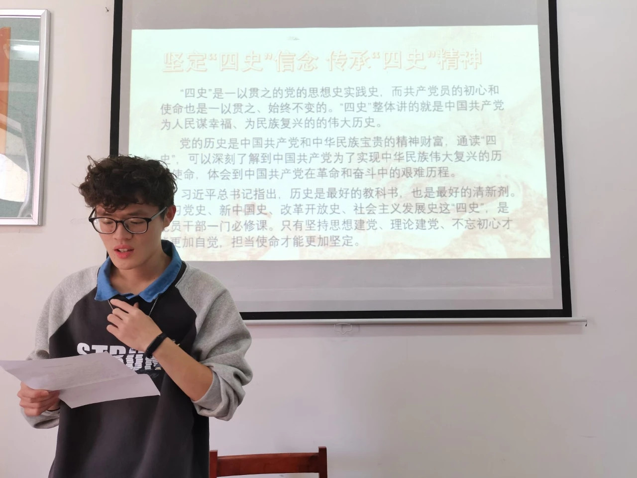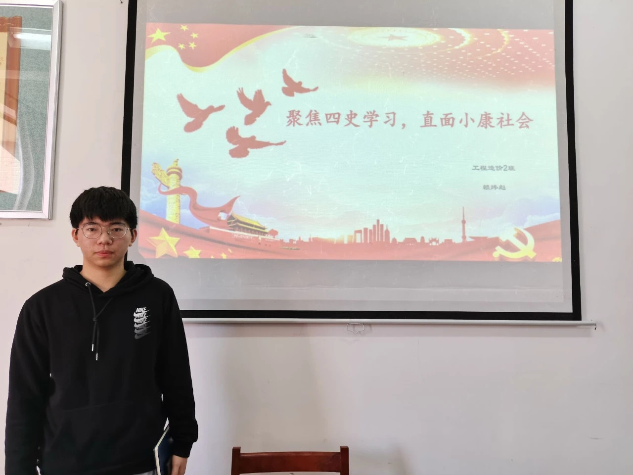 赖炜彪同学作了题为《聚焦“四史”学习 全面建成小康社会》的宣讲。他在宣讲中讲述了总书记曾经在福建工作时带领福建人民摆脱贫困的历史,并结合国家脱贫攻坚的历史分析了学习“四史”的重要性。他认为今年是全面建成小康社会的决胜之年,全国各个地区的脱贫工作都取得了巨大成就,我们要立足当下、抓住机遇、迎接挑战,自觉担当起实现中华民族伟大复兴的使命。