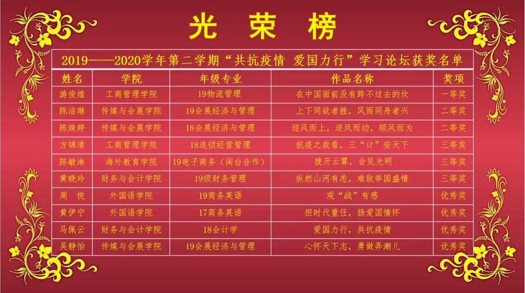 参赛选手围绕主题讲述抗击疫情中以医务人员为代表的各条战线彰显的“逆行者”精神和身边坚守一线、不怕牺牲、救死扶伤、无私奉献的英雄故事;宣传莘莘学子从我做起、加强自律、为社区服务、为群众分忧的青春故事。参赛选手的演讲紧扣主题、内容多样、角度新颖,有的讲述“逆行者”故事,生动感人;有的分享身边典型,激发大家共鸣;有的抒发爱国情感,引发师生思考。本次线上学习论坛历时一个多月,经过初赛、复赛、决赛的激烈角逐,共评选出10个获奖作品,工商管理学院19级物流管理专业游俊煌同学获得本次学习论坛一等奖,19级会展经济与管理专业陈洁琳等2位同学获得二等奖,18级连锁经营管理专业方锦清等3位同学获得三等奖,19级商务英语专业周悦等4位同学获得优秀奖。